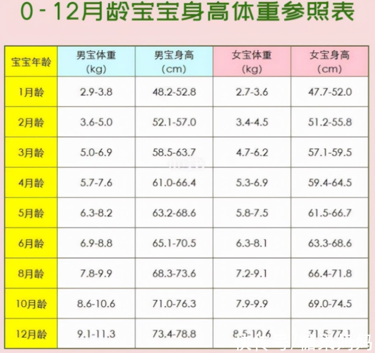 0~12月婴儿发育标准如下图,若宝宝发育值始终接近最低值,就要考虑辅食添加是否晚了。